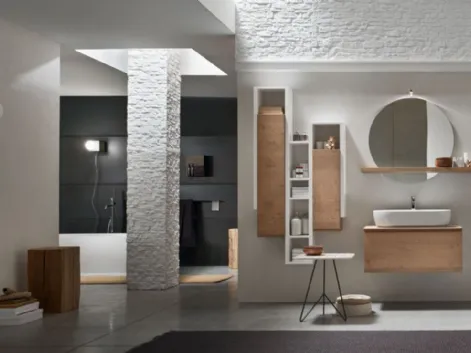 Arreda la stanza del benessere moderno ottimamente con Escape 23, mobili bagno sospesi e accessori in legno di Arcom.